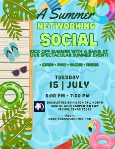 Come join us for a fun-filled evening of networking and socializing at our Summer Networking Social Event! This in-person event will be held at 4441 John W. Carpenter Fwy. It’s a great opportunity to meet new people, make connections, and have a good time. Win prizes and eat good food! Don’t miss out on this chance to expand your network and enjoy the summer vibes with like-minded individuals. See you there!